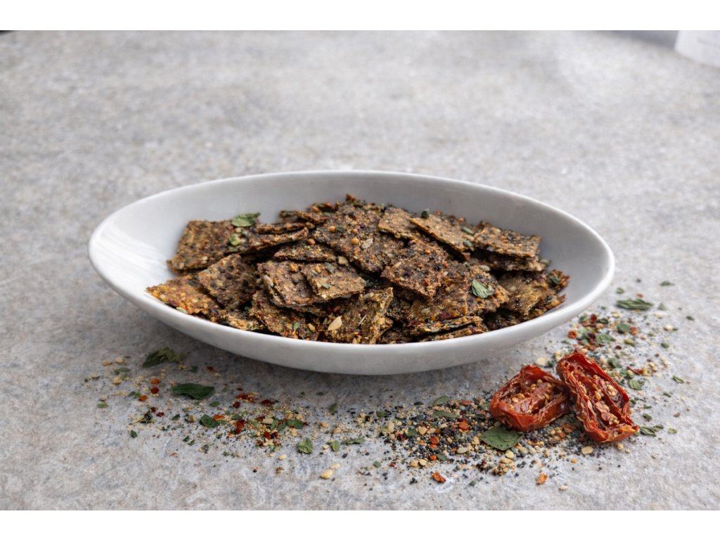 Hrachová vláknina,soľ,cícerová múka,semienka ľanové, slnečnicové,tekvicové,voda,oregáno,sušená cibuľa, cesnak,čierne korenie,sladká paprika,bazalka,šalvia, tymian,petržlenová vňať,